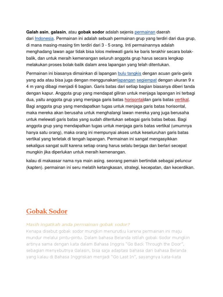 Permainan ini biasanya dimainkan di lapangan bulu tangkis dengan acuan garis garis yang ada atau bisa juga dengan menggunakan lapangan segiempat dengan ukuran 9 x 4 m yang dibagi menjadi 6 bagian. Sedangkan di jawa barat nama permainan ini adalah galah asin di makasar disebut asing dan di daerah batak toba disebut margala. Kelompok pertama sebagai penyerang dan kelompok kedua sebagai penjaga. Permainan galah asin atau gobak sodor kadang disebut galasin ini biasa dilakukan di lapangan. Untuk ukuran arena permainan kalian bisa memakai lapangan voli yang dibagi atas 6 ruang atau bisa dengan ukuran yang. Permainan asli indonesia ini banyak dimainakan karena memiliki cara bermain dan manfaat yang bagus.